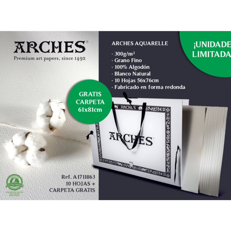 ¡Llega a Nova Rúa el papel Arches para acuarela, uno de los más apreciados por los artistas! Y no es para menos...Este papel está fabricado en forma redonda (método tradicional) por lo que se su calidad se aproxima a la del papel fabricado de forma artesanal. La rotación lenta del cilindro permite la disposición regular de las fibras y su distribución en todas direcciones. De este modo, las fibras se distribuyen de manera homogénea, el papel se destensa uniformemente cuando está mojado y esto, facilita un mayor control al artista. Este procedimiento permite producir papeles de alto gramaje como este, así como obtener papeles con barbas. Su composición es 100% algodón, fibras largas, confiriéndole al papel una blancura natural permanente, un tacto inimitable y garantizando su resistencia. De grano fino, prensado en frío y en color blanco natural, este papel ha sido tratado con un tratamiento fungicida preventivo contra la aparición de moho, con reserva alcalina, sin ácido, ni blanqueadores ópticos. Una exclusividad de Arches es que es el único molino de papel del mundo que realiza un gelatinado en la masa de su papel de acuarela; así, aunque esté mojado durante mucho tiempo, el papel conserva una cantidad suficiente de gelatina y no se vuelve demasiado absorbente, de modo que es ideal tanto para la acuarela como para todas las técnicas húmedas, como tinta, aguada y acrílico. Adquieriendo este producto, conseguirás diez hojas de este papel de excelente calidad y, además, una carpeta protectora de regalo, de aproximadamente 61 × 81 cm, ideal para guardar o transportar tus hojas sin doblarlas ni dañarlas.