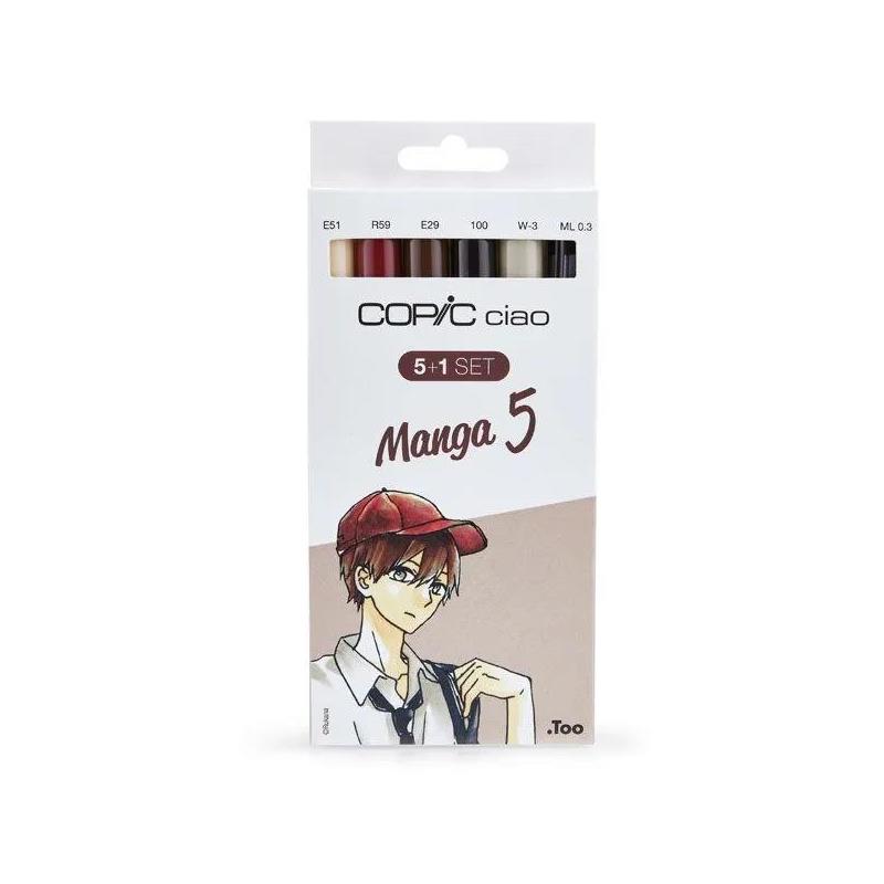 Detalles del producto: set de Copic Ciao Colores Manga 5. Contiene: 5 rotuladores Copic Ciao en los tonos E51, R59, E29, 100, W-3 y 1 multiliner Copic de 0.3 mm