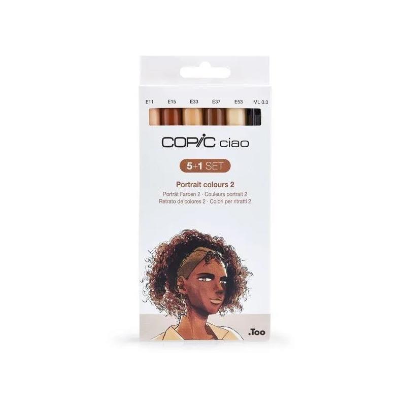 Detalles del producto: set de Copic Ciao Tonos Piel. Contiene: 5 rotuladores Copic Ciao en los tonos E11, E15, E33, E37, E53 y 1 multiliner Copic de 0.3 mm