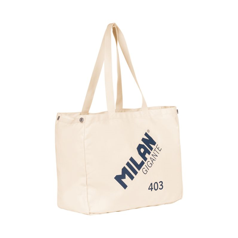 Bolso tote bag de gran capacidad de color beige, perfecto para llevar todas las pertenencias durante el día. Cuenta con un amplio compartimento principal, dos bolsillos interiores y una tira para colgarllaves o bolsas. Incluye botones magnéticos laterales que permiten ajustar su tamaño según las necesidades. Logotipo de la colección de color azul marino. Forma parte de la colección 403 MILAN GIGANTE since 1918, inspirada en los colores y diseño originales de las gomas de borrar MILAN, fabricadas en España desde 1918. Puede combinarse con el neceser y la bolsa de mano de la misma colección. Composición del tejido: 100% algodón. Medidas: 51 x 40, 5 x 21,5 cm. Capacidad: 40 litros. Cuidados: Lavado a mano máx. 30°, no planchar, no usar secadora,no usar lejía.