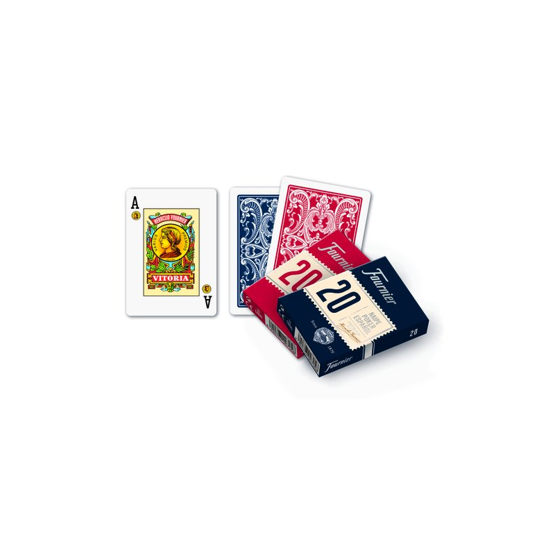 Baraja Modelo Nº 20 Fournier tipo póker, dos índices estándar, tamaño 63X89 mm, compuesta por 55 cartas, tres comodines, con reverso de color rojo o azul y estuche de cartón. Fabricadas en cartón de 300 gramos.