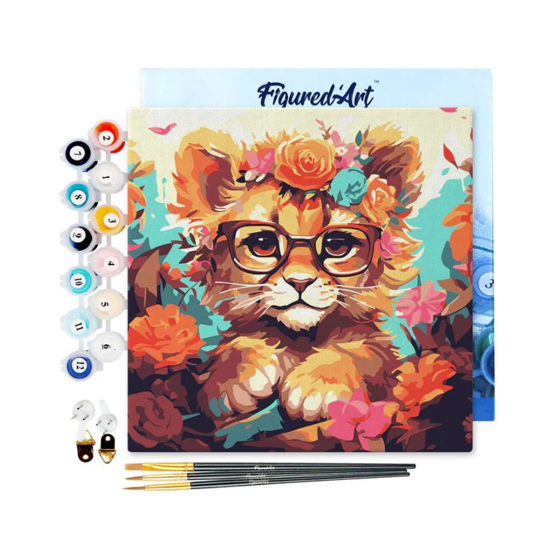 Detalles del producto: Mini Lienzo Pintura por Números Cachorro de León de fantasía y flores | Método de realización: pintura por números | Tamaño: 20 x 20 cm | Soporte: lienzo de lino numerado, montado en bastidor de madera | Incluye: 1 lienzo de lino numerado; 3 pinceles de nylon de diferentes tamaños; botes de pintura acrílica numerados; 1 fotografía en miniatura del resultado final; 2 tornillos + 2 ganchos para montaje en pared
