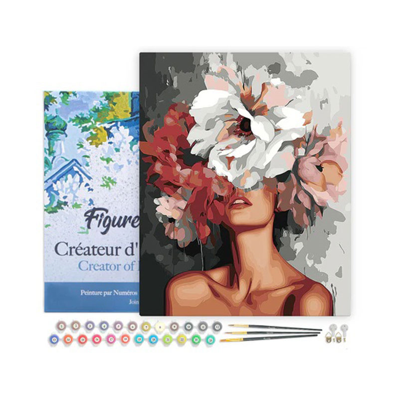 Detalles del producto: Lienzo Pintura por Números Belleza tras las Flores | Método de realización: pintura por números | Tamaño: 40 x 50 cm | Soporte: lienzo de lino numerado, montado en bastidor de madera | Incluye: 1 lienzo de lino numerado; 3 pinceles de nylon de diferentes tamaños; botes de pintura acrílica numerados; 1 fotografía en miniatura del resultado final; 2 tornillos + 2 ganchos para montaje en pared