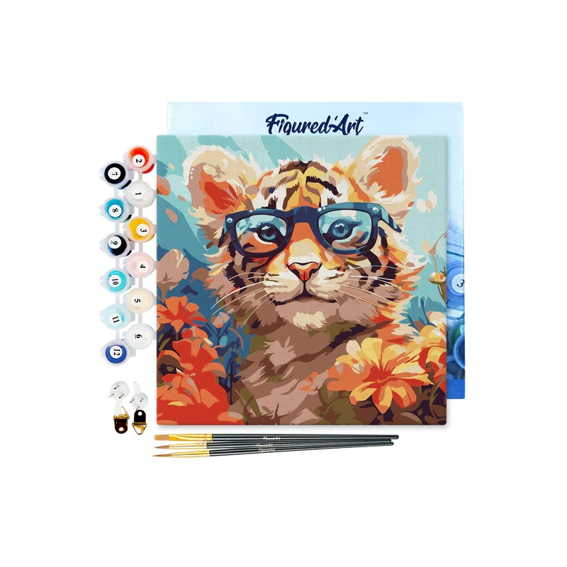 Detalles del producto: Mini Lienzo Pintura por Números Cachorro de Tigre | Método de realización: pintura por números | Tamaño: 20 x 20 cm | Soporte: lienzo de lino numerado, montado en bastidor de madera | Incluye: 1 lienzo de lino numerado; 3 pinceles de nylon de diferentes tamaños; botes de pintura acrílica numerados; 1 fotografía en miniatura del resultado final; 2 tornillos + 2 ganchos para montaje en pared
