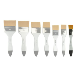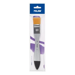 Paletina con mango corto de madera, barnizado plateado y virola niquelada. Composición: pelo sintético (filamentos de Ø 0,10 mm). Adecuado paraacuarela y técnicas acuosas, pintura al óleo y acrílico. Anchura del pelo: 25 mm. Longitud del pelo: 25,2 mm. Longitud de la paletina: 185 mm.