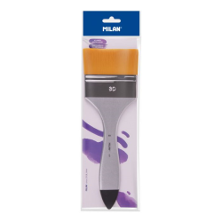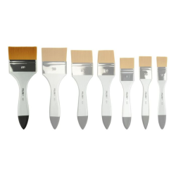 Paletina con mango corto de madera, barnizado plateado y virola niquelada. Composición: pelo sintético (filamentos de Ø 0,10 mm). Adecuado paraacuarela y técnicas acuosas, pintura al óleo y acrílico. Anchura del pelo: 80 mm. Longitud del pelo: 38 mm. Longitud de la paletina: 237 mm.