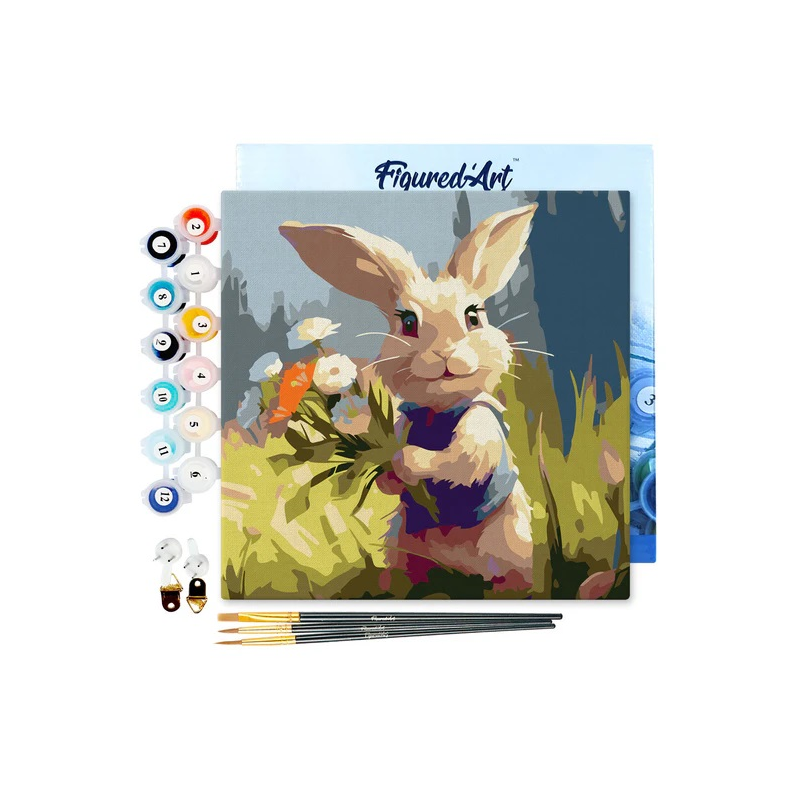 Detalles del producto: Mini Lienzo Pintura por Números Conejo y Flores | Método de realización: pintura por números | Tamaño: 20 x 20 cm | Soporte: lienzo de lino numerado, montado en bastidor de madera | Incluye: 1 lienzo de lino numerado; 3 pinceles de nylon de diferentes tamaños; botes de pintura acrílica numerados; 1 fotografía en miniatura del resultado final; 2 tornillos + 2 ganchos para montaje en pared