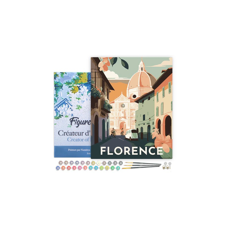 Detalles del producto: Lienzo Pintura por Números Póster de Florencia | Método de realización: pintura por números | Tamaño: 40 x 50 cm | Soporte: lienzo de lino numerado, montado en bastidor de madera | Incluye: 1 lienzo de lino numerado; 3 pinceles de nylon de diferentes tamaños; botes de pintura acrílica numerados; 1 fotografía en miniatura del resultado final; 2 tornillos + 2 ganchos para montaje en pared