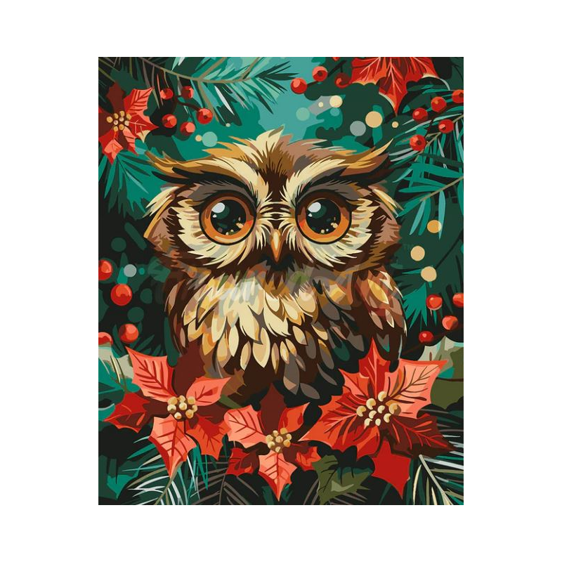 Detalles del producto: Lienzo Pintura por Números Búho Navideño | Método de realización: pintura por números | Tamaño: 40 x 50 cm | Soporte: lienzo de lino numerado, montado en bastidor de madera | Incluye: 1 lienzo de lino numerado; 3 pinceles de nylon de diferentes tamaños; botes de pintura acrílica numerados; 1 fotografía en miniatura del resultado final; 2 tornillos + 2 ganchos para montaje en pared