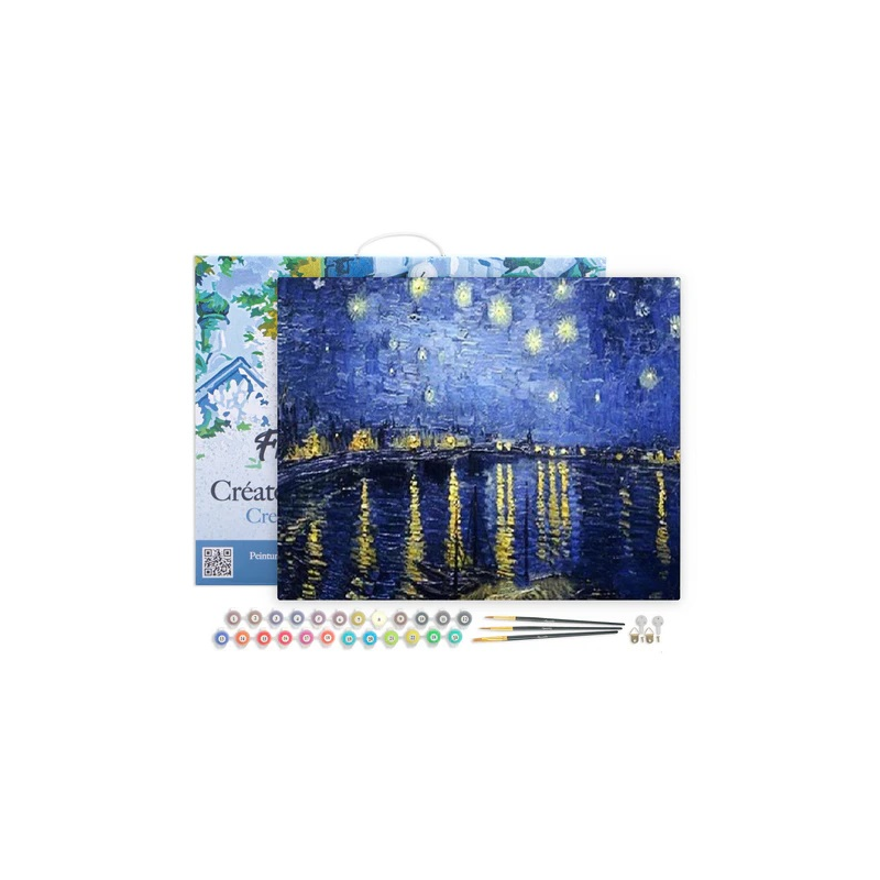 Detalles del producto: Lienzo Pintura por Números Van Gogh Noche Estrellada sobre el Ródano | Método de realización: pintura por números | Tamaño: 40 x 50 cm | Soporte: lienzo de lino numerado, montado en bastidor de madera | Incluye: 1 lienzo de lino numerado; 3 pinceles de nylon de diferentes tamaños; botes de pintura acrílica numerados; 1 fotografía en miniatura del resultado final; 2 tornillos + 2 ganchos para montaje en pared