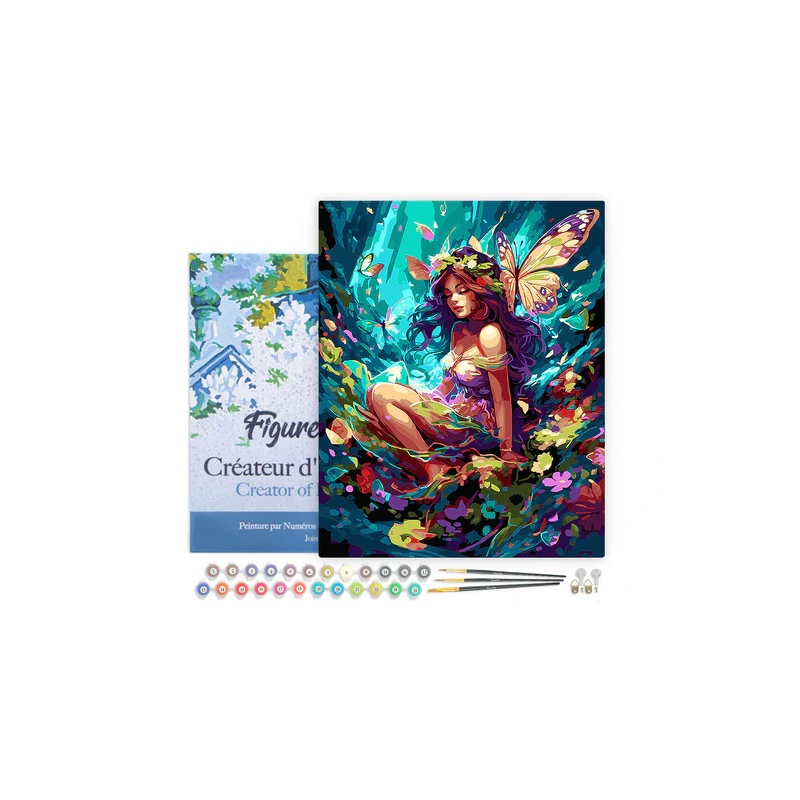 Detalles del producto: Lienzo Pintura por Números Hada y Mariposas | Método de realización: pintura por números | Tamaño: 40 x 50 cm | Soporte: lienzo de lino numerado, montado en bastidor de madera | Incluye: 1 lienzo de lino numerado; 3 pinceles de nylon de diferentes tamaños; botes de pintura acrílica numerados; 1 fotografía en miniatura del resultado final; 2 tornillos + 2 ganchos para montaje en pared