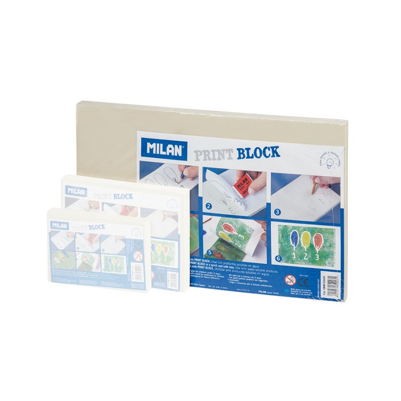 Print Block es una plancha de caucho sintético fácilmente manejable y adaptada al uso infantil, ya que cumple con las normativas de seguridad europeas (no contiene ftalatos, ni aditivos aromáticos y es libre de látex). Gracias a su composición, su suavidad y baja dureza, es fácil de trabajar con gubias para grabado en relieve e incluso con el mango afilado de un pincel. Puede estamparse directamente ejerciendo presión con las manos. Se lava fácilmente después de su uso y puede reutilizarse. Plancha grande: 17x28,3x0,9 cm.