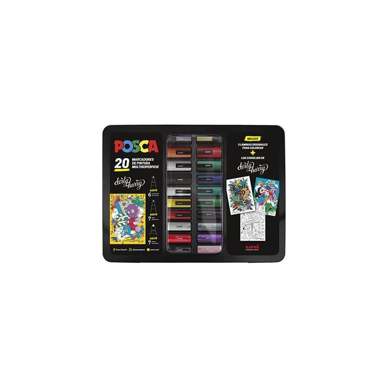 Detalles del producto: Contiene: 6 rotuladores Posca PC-1M extra finos (0,7-1,0 mm): negro, plata, oro, blanco, violeta, rojo | 7 rotuladores Posca PC-3M finos (0,9-1,3 mm): azul, rojo, verde, amarillo, violeta blanco, negro | 7 rotuladores Posca PC-5M medios (1,8-2,5 mm): negro, rojo, verde claro, oro, plata, blanco, naranja | 3 láminas originales para colorear, del dibujante e ilustrador Alfredo García Almonacido, conocido artísticamente como Dirty Harry