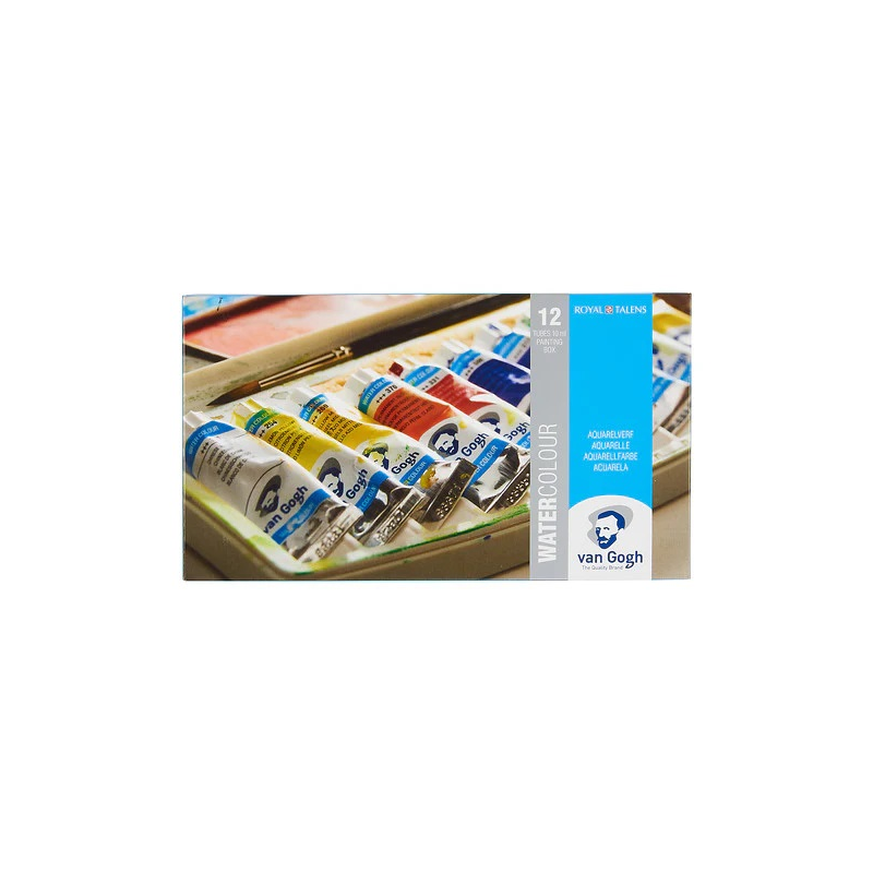 Las acuarelas Van Gogh están clasificadas como gama de pintura de nivel de estudiante y artista. Ofrecen colores brillantes, transparentes e intensos con un gran poder colorante. La mayor parte de los colores están clasificados con el mayor grado de resistencia a la luz, +++ (más de 100 años en iluminación de museo), mientras que unos pocos están clasificados en la categoría siguiente, ++ (entre 25 y 100 años en iluminación de museo). Gracias a su pureza y su viscosidad uniforme, es fácil mezclar estas acuarelas y trabajar con ellas. Producidas con orgullo en Holanda con un estricto control de calidad para lograr una experiencia constante con cada compra. Este set de 12 tubos de acuarela de 10 ml viene en un estuche de plástico, y también incluye un pincel redondo de pelo sintético (tamaño 6) y una esponja. Los colores que vienen en la selección general son los siguientes: Amarillo limón permanente 254, Amarillo azo medio 269, Rojo permanente claro 370, Laca granza oscuro 331, Azul cobalto ultramar 512, Azul ultramar oscuro 506, Verde permanente 662, Verde esmeralda 616, Ocre amarillo 227, Tierra Siena tostado 411, Gris Payne 708, Blanco de China 108.