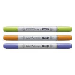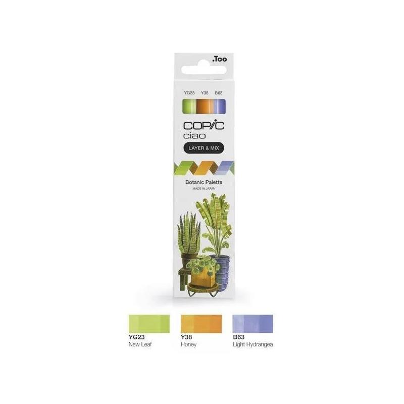 Detalles del producto: Set Rotuladores Copic Ciao 3 Botanic Palette. Contiene: tres rotuladores Copic en los tonos YG-23 (New Leaf), Y38 (Honey) y B63 (Light Hydrangea)