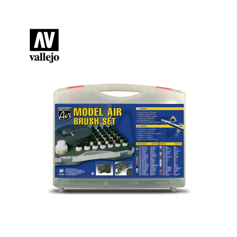 Maletín 29 colores + aerógrafo. Model Air Model Air Basic Colors. Incluye: 29 colores Model Air, un aerógrafo Ultra H. S., Manguera 2,5 m, conexión rápida para compresor, 1 Limpiador de Aerógrafo, y una carta de colores.. Envases de 17 ml.