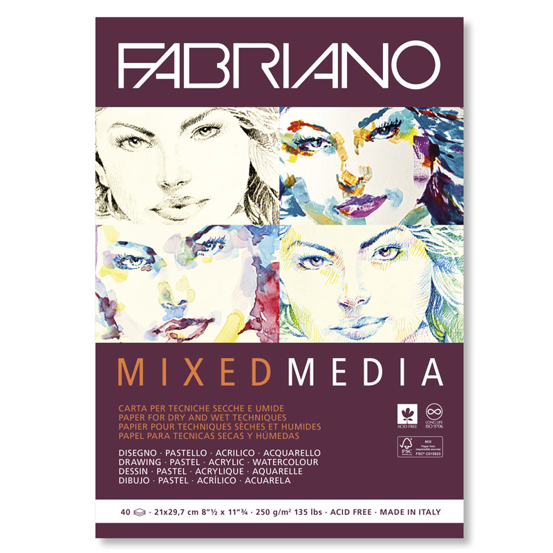 Fabriano Mixed Media es un papel que combina las características de los papeles para acuarela y acrílico con las del dibujo con lápices y pastel. Un solo soporte en 250 g/m², disponible en hojas y blocs encolados un lado, que permite experimentar la combinación de distintas técnicas.